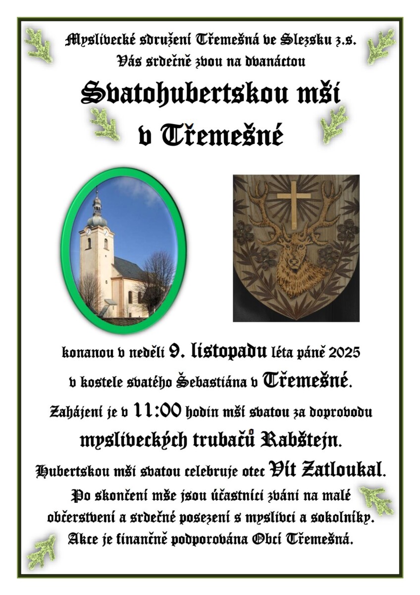 Myslivecké sdružení Třemešná ve Slezsku z.s. srdečně zve myslivce i širokou veřejnost na tradiční, již dvanáctou Hubertskou mši svatou v Třemešné. Patrona myslivců, svatého Huberta, uctí bohoslužbou v neděli dne 9. listopadu 2025 od 11:00 v kostele svatého Šebastiána v Třemešné. Svatohubertskou mši bude celebrovat otec Vít Zatloukal. Celou mší svatou zazní troubená a zpívaná Hubertská mše B dur v podání mysliveckých trubačů Rabštejn. Akce je finančně podporována obcí Třemešná.