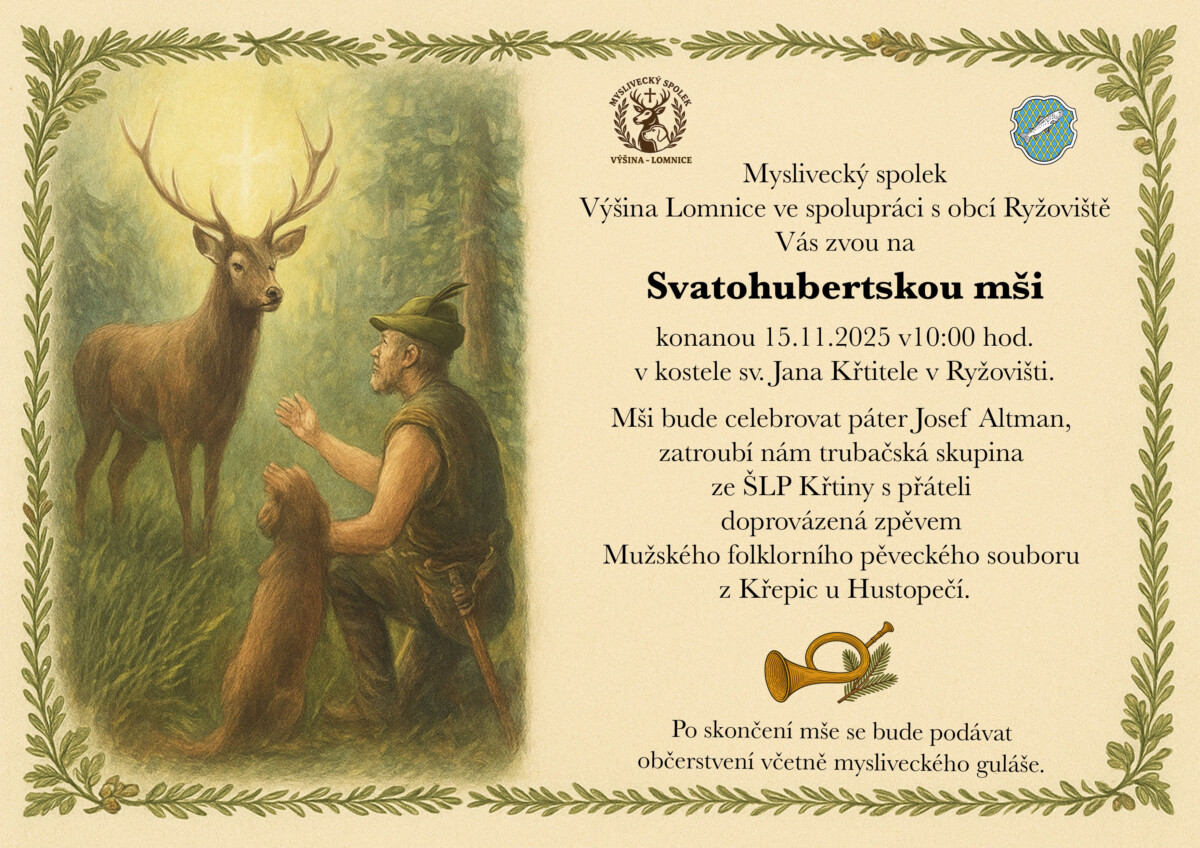 Po skončení mše jsou všichni účastníci srdečně zváni na společné posezení s myslivci, trubači a sokolníci v kulturním domě. Myslivecká kuchyně a občerstvení zajištěno.